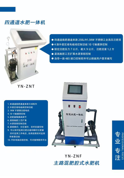 基本功能:單通道施肥,可擴(kuò)展4通道吸肥1KW不銹鋼施肥泵7寸觸摸屏控制進(jìn)肥量隔膜閥調(diào)節(jié)自動(dòng)混肥攪拌功能